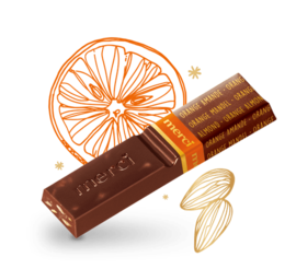 Aromatická hořká čokoláda s kousky pomeranče a křupavých mandlí.