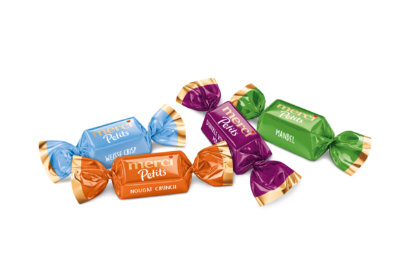 merci Petits – malé, jemné čokoládky merci v příchutích káva a smetana, mléčné, mandle a smetana, hořké, nugát a smetana, kakaová pěna a pralinky a smetana.